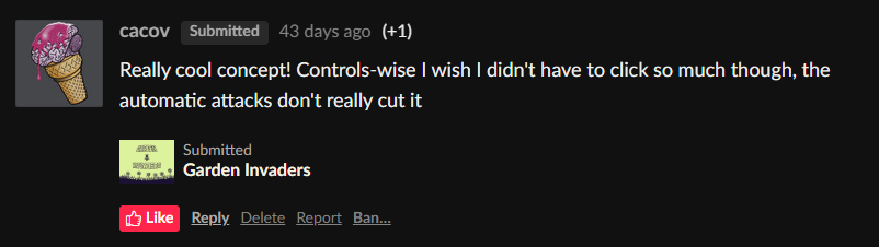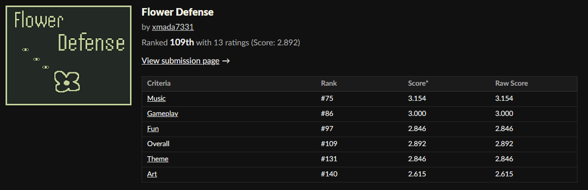 The game jam concluded and Flower Defense has taken a proud 109th place out of 203 games. Not so bad for my third game ever made and second game made for a jam. Yet again, winning was never my goal. I wanted to see if I am able to create a game from scratch in a week. And I did. I tested a couple of other games made for the jam and they were all very different, but also very impressive.