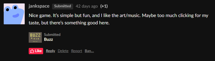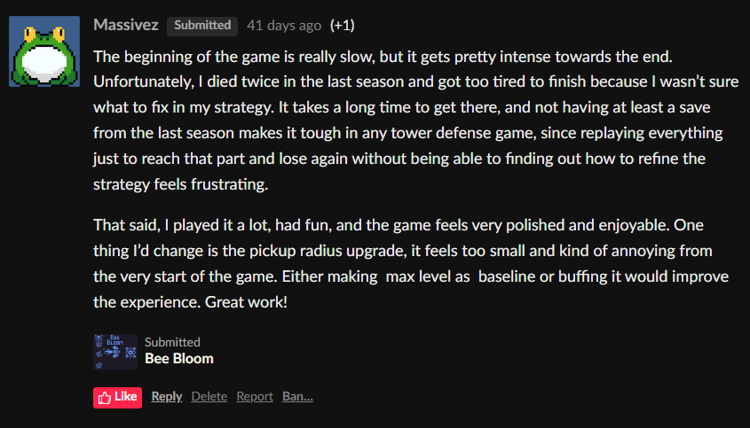 The lucky winners of the color pallette were greeny-yellowy rgb(194, 209, 155) and dark grim green rgb(35, 41, 36), which coincidently were very similar to the B1T Jam page colors. I think it fits in the game pretty well, yet I did not experiment with other colors all that much. What was important to me was to make smooth, soothing color, so the player doesn't get a headache after staring in the screen for too long. I'm a night mode user myself, so I couldn't possibly make it any other way. In the updated version of the game the color pallette changes based on the season you are in. I thought of updating the game after the jam, as I really enjoyed not only making it, but also playing it. The feedback of other people playing it was crucial to make it better. Every game submitted for the game jam has its own page where other people can rate it and leave a comment. From the comments under Flower Defense I noticed a lot of people complained that they had to click too much and the game was too difficult. I managed to (hopefully) fix these things as well as add some quality of life improvements. This time the game had proper start, how to play section and ending which made the game feel complete and easily modifiable for potential future updates.