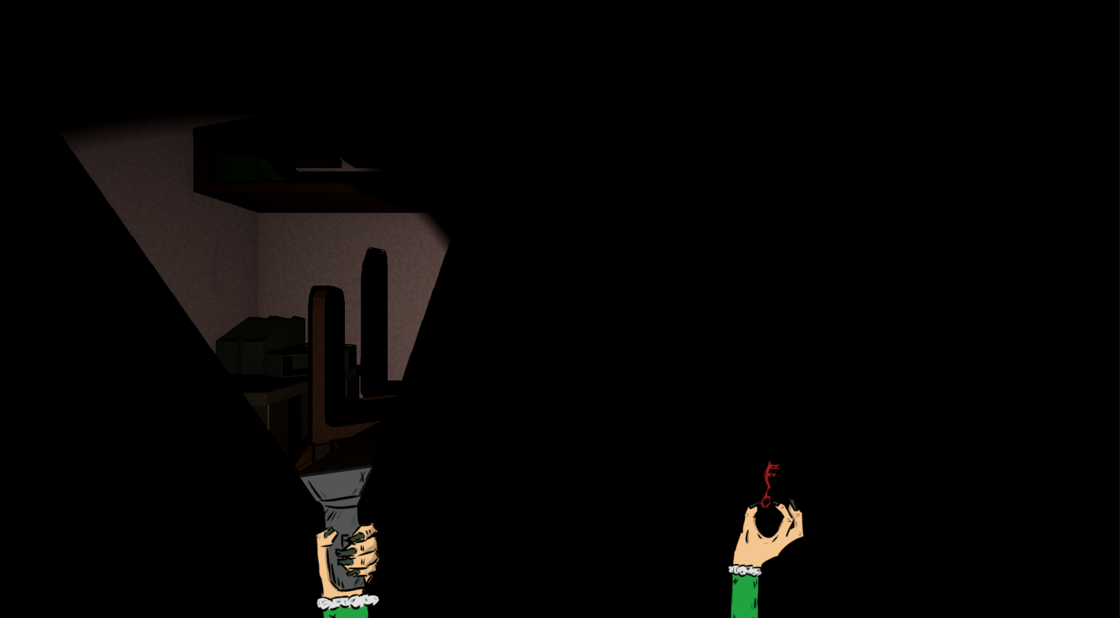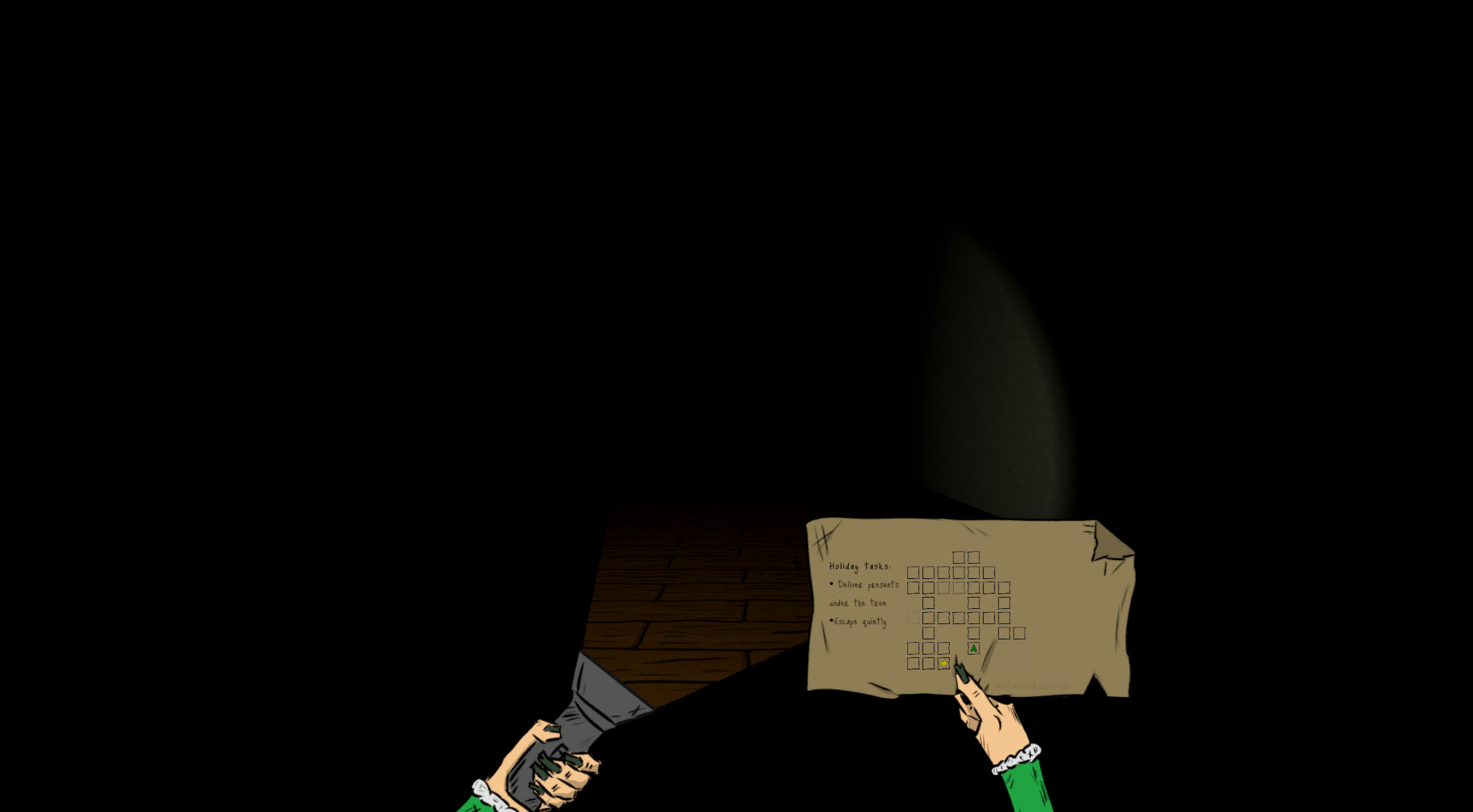 I came up with a cool (I think) mechanic that makes the player use the flashlight in a special way. At all times the player can see elf's hands. The left one is always holding the flashlight and the right one serves a few purposes. The flashlight sends out a stream of light through which the player can see the environment. Everything else is blacked out. The light stream is a flat 2D plane that moves left and right, its position anchored on the hand. The player uses the keyboard to move the elf and mouse to move the hand with the flashlight and pick up keys or open doors. Right hand serves three purposes: it displays a map, it holds the picked up key and it can flick the flashlight if it runs out of battery. All three are essential and would be used at some point in the game. The player needs a map to navigate, hold the key to open the door and flick the flashlight to see the keys he needs to pick up.